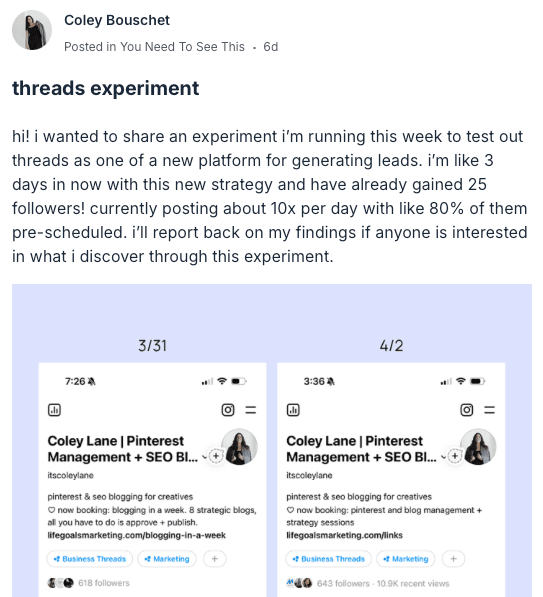 One of our favorite things is seeing the experiments (and results) that people share inside of The Breakroom - with IG traffic "feeling different" recently we've had a few members experimenting with cross posting, and trying new marketing methods on other platforms.